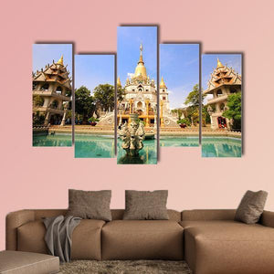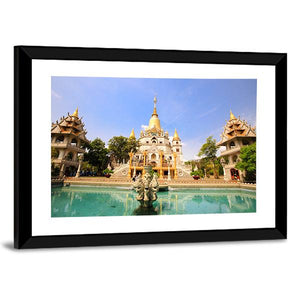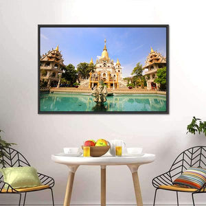 Buu Long Pagoda Canvas Wall Art depicts a symmetrical temple scene with a gold-tipped stupa, ornate facade, pond, and decorative statues. The image feels serene and spiritual, using a palette of gold, white, blue, green, and tan. It suits home spaces and meditation areas with traditional décor.