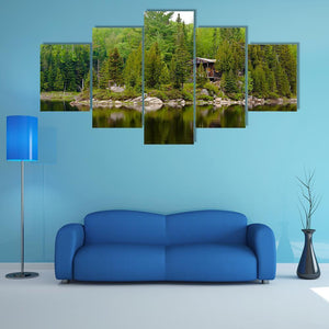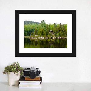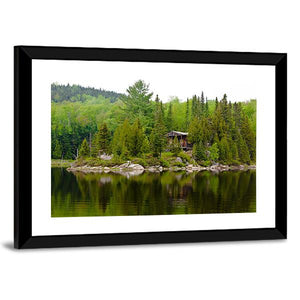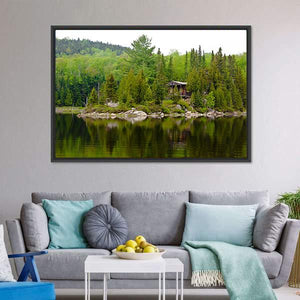 This canvas art features a rustic cabin by a tranquil lake, surrounded by lush trees. The serene palette of greens, browns, and grays evokes a peaceful, natural atmosphere, making it a lovely addition to any wall.
