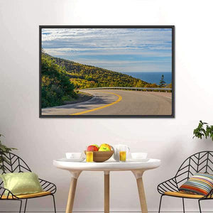 Cabot Trail Highway Canvas Wall Art captures a curving coastal road with yellow center lines, fall-colored trees, and the ocean beneath a partly cloudy sky. The nature-photography print feels serene and scenic, with green, yellow, blue, and brown tones. It works well in living rooms, hallways, or other nature-inspired spaces seeking calm wall decor.