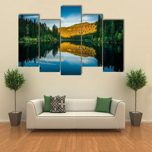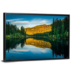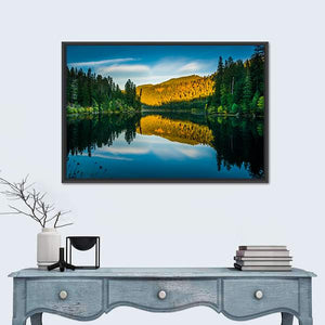 Toketee Lake in Oregon Canvas Wall Art shows a calm lake framed by forest and mountains, with sunlight on the peaks and the water reflecting sky and trees. The realistic, symmetrical composition creates a serene, natural mood. It suits home spaces and nature-inspired decor.