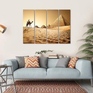 This canvas art captures a serene desert scene featuring a majestic camel and ancient pyramids. The warm palette of golden sands and deep browns evokes a tranquil atmosphere, perfect for adding a touch of nature to any space.