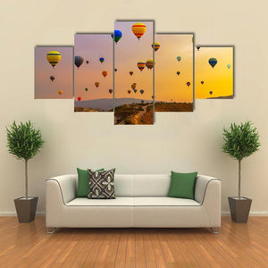 Experience a dreamy adventure with our Hot Air Balloons Canvas Wall Art. This vibrant landscape features colorful hot air balloons soaring above rocky formations and a quaint town, all set against a stunning sunset sky.