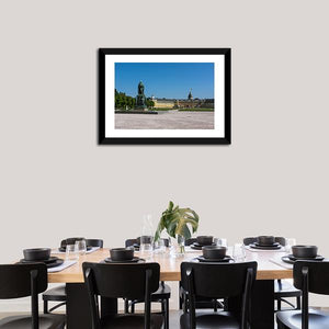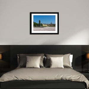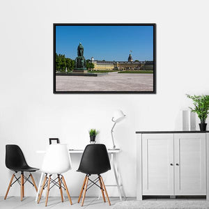 A realistic landscape canvas that shows a castle park with a bronze statue on a pedestal and a long yellow building with a dome. Bathed in sunny blues, greens, yellows and soft grays, the scene reads as grand and open and works well with modern room decor.