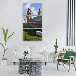 This canvas depicts Pecs Cathedral in Hungary, with two church towers and spires set against a bright blue sky. A low stone wall, a young tree and a sweep of lawn create a peaceful, historical scene that suits modern or classic room decor such as living rooms, entryways, or studies.