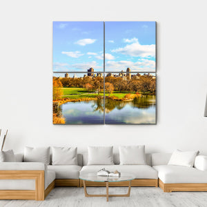 Capture the serene beauty of Central Park in autumn with this canvas wall art. Featuring a peaceful blend of trees, a tranquil lake, and a city skyline, it reflects the vibrant colors of fall foliage. This artwork invites a touch of urban nature into your space.