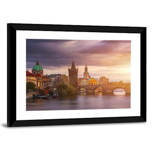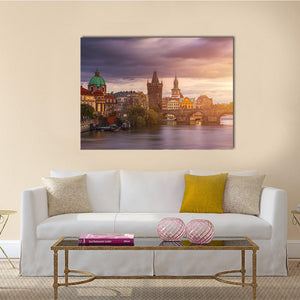 This photorealistic cityscape shows Charles Bridge, Prague Castle and the Vltava River at sunset, captured from an aerial vantage. Purple and orange sunset tones, dramatic clouds and reflections on the water give the scene an atmospheric, serene mood. The composition uses depth and the rule of thirds to guide the eye, making it a good fit for modern living rooms or entryways.