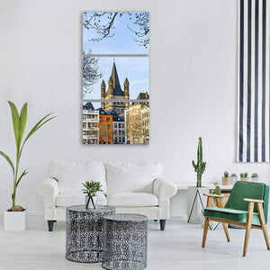 A realistic cityscape of a tall-spired cathedral in Cologne, set against a clear daytime sky with multi-story buildings and bare tree branches. The image carries a bright, historic architectural mood rendered in blue, brown, orange, and grey. It fits modern or classic interiors that want architectural interest on their walls.