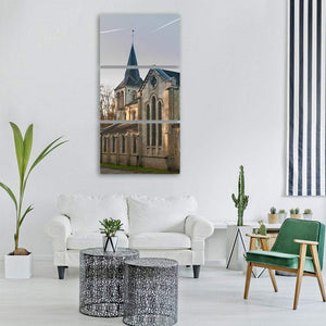 A realistic depiction of a church with a tall steeple, arched windows, and a stone facade, rendered in tan, grey, blue, and white. The scene feels historic, serene, and grand and works well in traditional or modern interiors as a focal canvas piece.