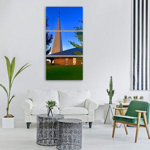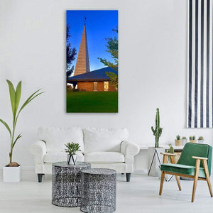 Church in Zurich shows a centered church steeple and brick building set among trees and a lawn, bathed in twilight blues with warm yellow light glowing from stained-glass windows. This architectural photograph has a serene, contemplative mood that suits modern or architectural-focused interiors.