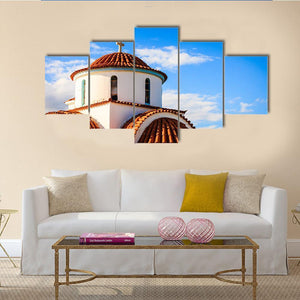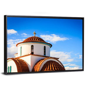Church Of Agios Petros shows a close-up of a church dome, tiled roof and arched windows beneath a bright blue, cloud-streaked sky. Rendered in a realistic, sunlit palette of white, blue, orange and brown, the image feels serene and peaceful. It suits modern home decor as a calm architectural accent.