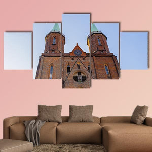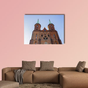 A low-angle, symmetrical view of the Church of the Virgin Mary in Poland, showing its twin towers, ornate window, pointed arches and clock face. Rendered in a realistic architectural style with brick-red, blue, green and gray tones, the image reads as majestic and historic—well suited to historic or architectural interiors and modern living spaces.