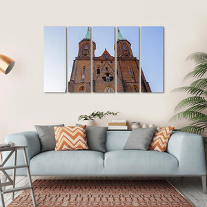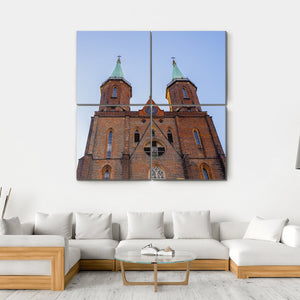 This canvas art captures the majestic Church of Virgin Mary in Poland, showcasing its stunning Gothic architecture. The low angle view highlights the twin towers, arched windows, and the clock face against a backdrop of a blue sky and green accents, evoking a grand and solemn atmosphere.