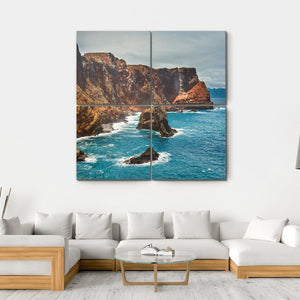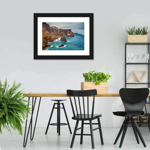 This canvas art captures the powerful beauty of coastal cliffs at Ponta De Sao Lourenco, where rugged rocks meet the crashing waves of the ocean. The dramatic palette of blues, browns, and oranges evokes a serene yet intense atmosphere, perfect for enhancing any room's decor.