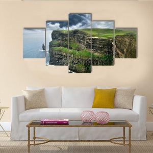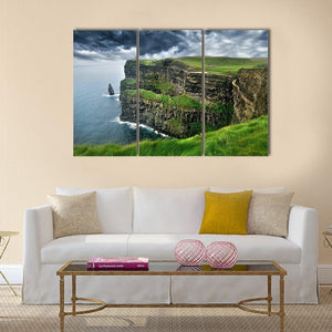 This striking canvas art depicts the dramatic cliffs of Moher under a stormy sky, capturing the raw beauty of coastal nature. The layered composition showcases grass-covered clifftops and sea stacks, evoking a moody and natural atmosphere.
