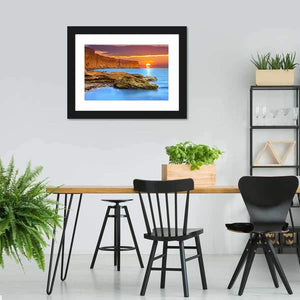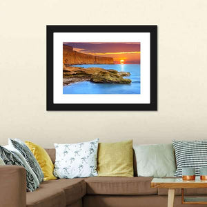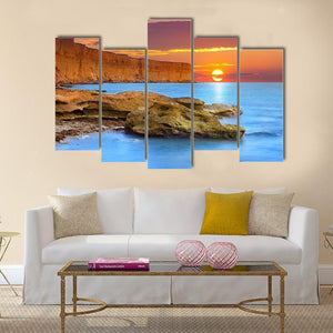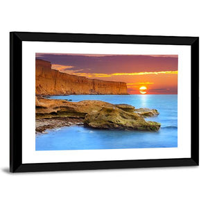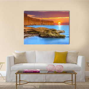 Ocean and rugged cliffs meet a low sun in this realistic, photographic seascape that leans into a serene, majestic mood. Warm orange and cool blue tones, layered clouds, and rock formations in the foreground give the piece a tranquil coastal feel that suits modern or house room decor.