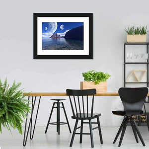 A serene, otherworldly fantasy landscape set on an alien planet — multiple moons hang above distant mountains while clear ocean water reveals the seabed. Rendered in cool blues with brown and green accents, this digital art print suits modern living rooms, bedrooms, or home offices looking for a calm, vast focal piece.