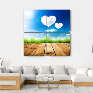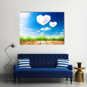 This artwork captures heart-shaped clouds floating in a serene blue sky, surrounded by green grass and a wooden deck. Its romantic and peaceful vibe makes it an ideal choice for bringing a gentle touch of nature into your space.