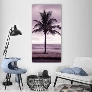 A centered coconut palm stands beside gentle waves under an overcast sky, giving the beach scene a calm, contemplative mood. Muted purples, blues, browns, and greys lend a moody, atmospheric feel. Suits modern or coastal room decor as a serene focal piece.