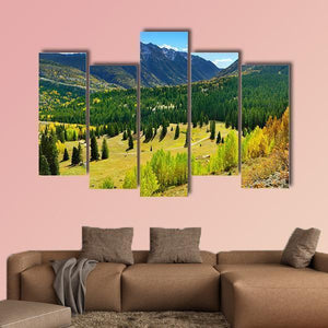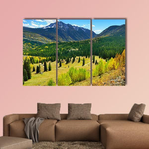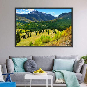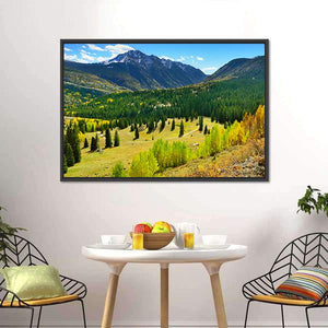 Mountains In Colorado depicts a realistic autumn landscape with snow-capped peaks, yellow-leaved trees, dense evergreens, and a grassy valley that creates a sense of depth. The scene feels serene and majestic, a calm focal piece for modern or nature-focused rooms like living rooms, entryways, or home offices.