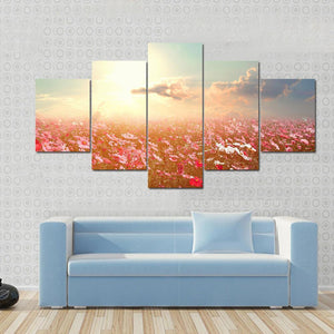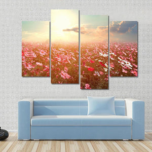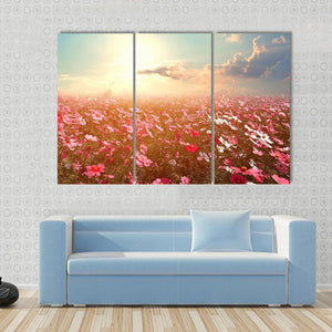 This canvas art features a dreamy field of cosmos flowers bathed in sunlight. With a vibrant palette of pinks, whites, and greens, it brings a serene atmosphere to any space.