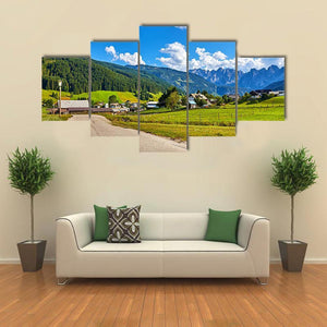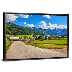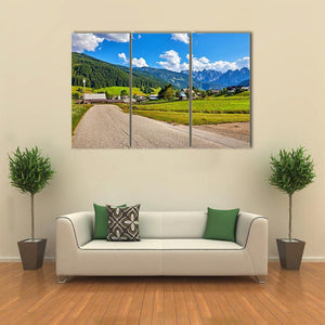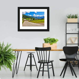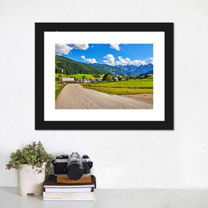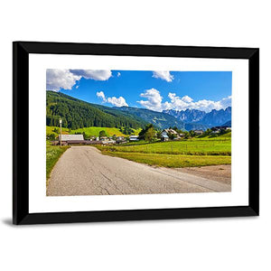 Country Road Austria depicts a mountain village and a country road framed by green hills and snow‑capped mountains under puffy white clouds. The cracked asphalt road leads the eye into depth with a peaceful, picturesque mood, making this realistic landscape a good fit for modern living rooms or hallways.