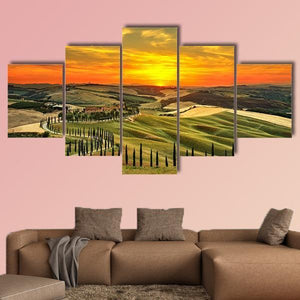Countryside Farm Italy Canvas Wall Art shows rolling hills, rows of cypress trees, a winding road, and a farmhouse bathed in golden sunset light. The realistic, picturesque scene feels warm and serene, with green, gold and orange tones. It works well as room decor for living rooms, dining areas, or hallways with modern or rustic styles.