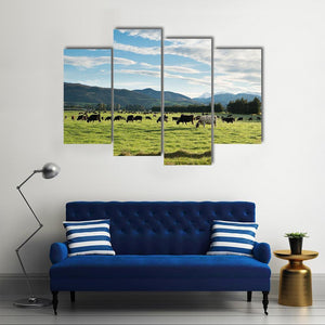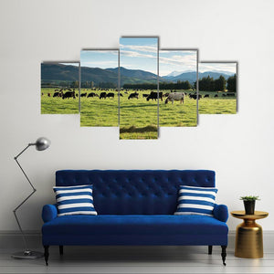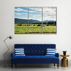 Cows In Green Field Canvas depicts cows grazing in a green pasture under a blue sky and distant mountains, presented in a realistic, peaceful pastoral style. The image uses a rule-of-thirds composition and the triptych format makes it a calm, nature-focused choice for modern interiors and home decor.