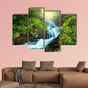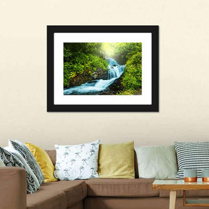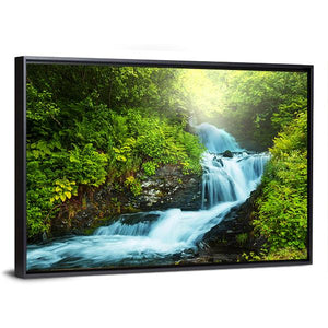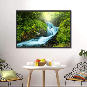 Creek In Forest Canvas Wall Art shows a forest creek and waterfall with sunbeams filtering through the trees. The green-and-blue palette and natural light create a serene, vibrant mood; it suits modern homes and nature-themed rooms.