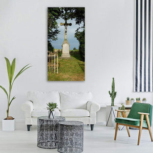 A weathered stone cross and wrought-iron gate stand at the center of this France landscape, framed by a grassy path and trees beneath a gray-blue, overcast sky. The realistic, traditional scene reads solemn and serene, with a palette of green, white, gray, blue and touches of gold. Suited to traditional or classic interiors.
