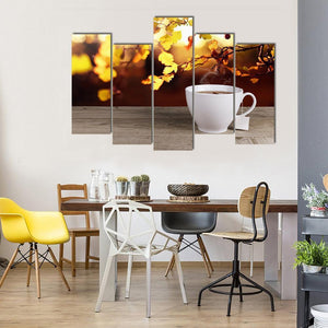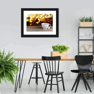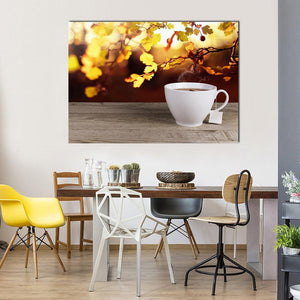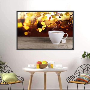 This canvas art beautifully captures a serene tea cup surrounded by autumn leaves and gentle steam. The warm color palette of yellow, brown, and orange invites a cozy and tranquil atmosphere, making it a perfect addition to any room decor.
