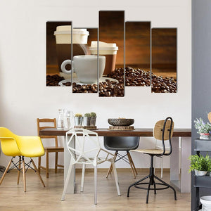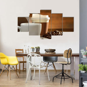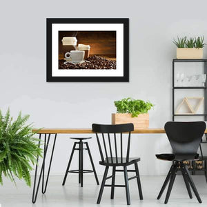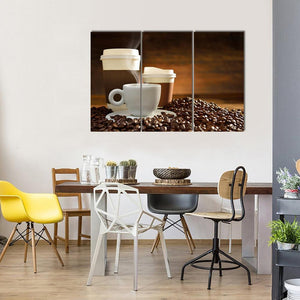 This canvas wall art features a close-up of a coffee cup and roasted beans, evoking a warm and cozy atmosphere. The rich browns and soft whites create an inviting vibe, perfect for kitchen or living room décor.