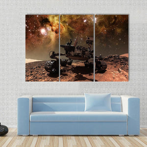 Explore the vastness of Mars with this engaging canvas art featuring the Curiosity rover against a starry sky and rocky terrain. The awe-inspiring palette of reds, oranges, and blacks enhances the exploratory vibe, making it a compelling piece for any modern decor.