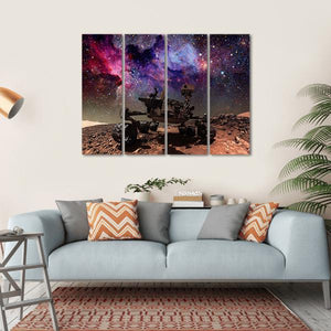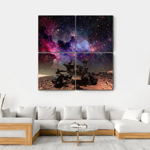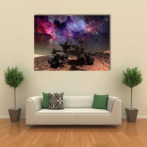 The Curiosity rover explores the Martian landscape amidst a vibrant nebula filled with stars. This piece captures an awe-inspiring and exploratory mood, making it a striking addition to any art collection.
