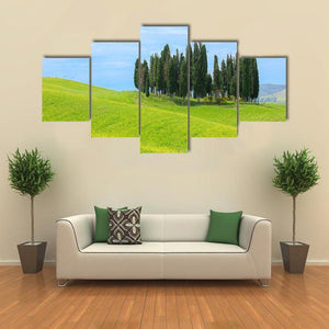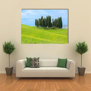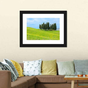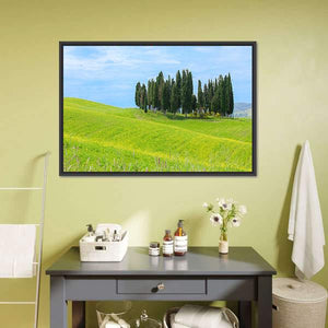 Cypress Trees In Tuscany shows tall cypress trees and rolling hills beneath a clear blue sky, with a field of wildflowers adding soft yellow tones. The realistic landscape uses greens, blues, yellows and browns and highlights slight grass texture and linear tree shadows to create a serene, pastoral mood that fits modern or nature-inspired rooms.