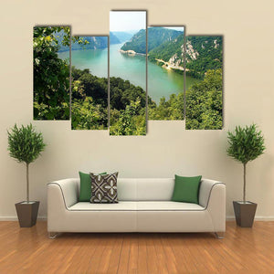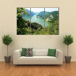 Danube Valley Canvas Wall Art captures an aerial view of a winding river through mountains and dense forest, with rocky cliffs and a distant road. The realistic scene feels peaceful and scenic, with greens, blues and browns that suit modern living spaces and home decor.