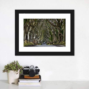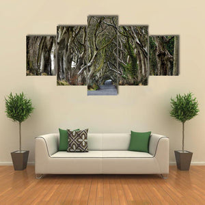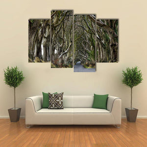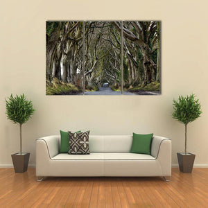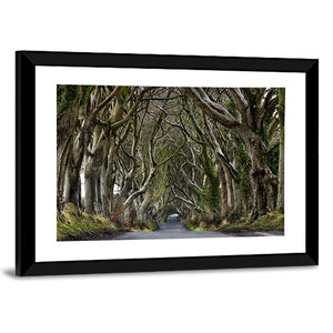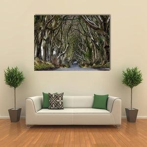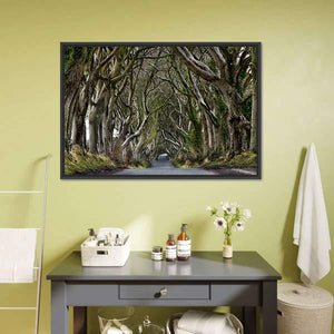 Dark Hedges Canvas Wall Art depicts a tree tunnel over a paved road, rendered in a realistic landscape with muted greens, browns, and grays. The scene feels mysterious and serene and pairs well with modern or nature-inspired room decor as a calm, natural focal point.