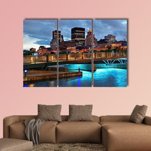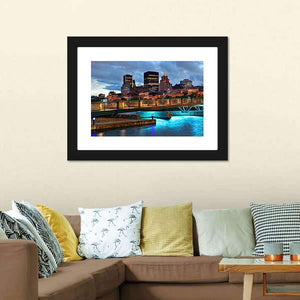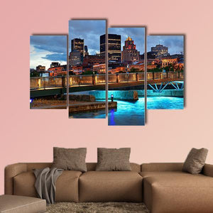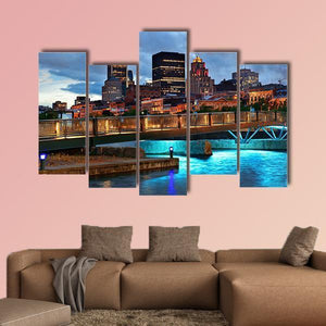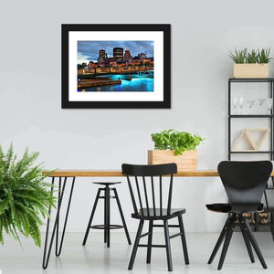Old Street In Montreal Canvas Wall Art shows a balanced city skyline with a bridge and water, rendered in a dramatic, vibrant nighttime mood. Illuminated buildings and glowing water in blue, orange, gray, and black tones bring energy to the scene and suit modern living rooms or offices.
