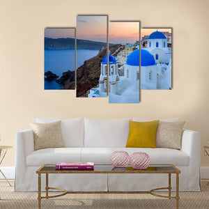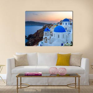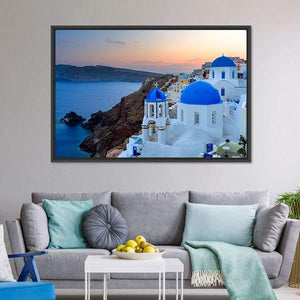 This landscape canvas art captures serene blue domed churches amidst picturesque cliffs and ocean vistas in Santorini, Greece. The tranquil palette of blue and white evokes a calming atmosphere, making it a lovely addition to any room.
