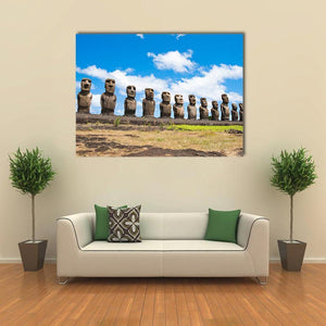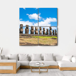 This canvas art features moai statues against a serene backdrop reminiscent of Easter Island, capturing the iconic beauty of these ancient figures. The photorealistic style and calming palette of blues, greens, and browns invite a tranquil atmosphere, perfect for your living space or office.