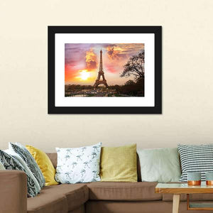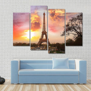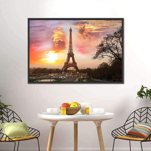 This canvas features the iconic Eiffel Tower set against a breathtaking sunset sky. The artwork captures a romantic and serene mood, highlighted by illuminated clouds and a vibrant color palette of orange, pink, and yellow.
