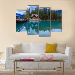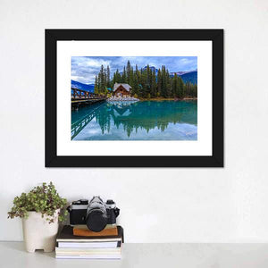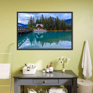 Emerald Lake Canada Canvas Wall Art shows a quiet lakeside with a cabin, pine trees, and a wooden bridge reflected in the water. The realistic blues, greens, browns and gray sky give the scene a serene, peaceful, idyllic mood that suits nature-inspired or modern rooms.