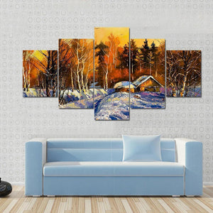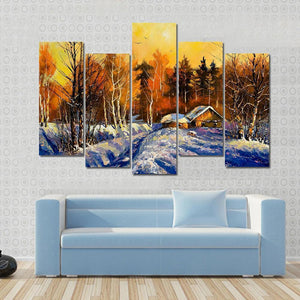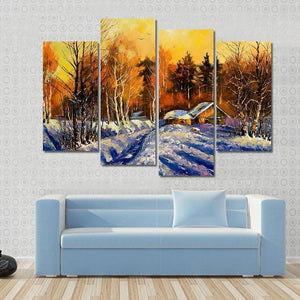 This canvas captures a serene winter landscape featuring a snowy path, framed by graceful winter trees and cozy cabins. With warm light glowing against the cool tones of evening, it adds inviting charm to your space.