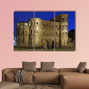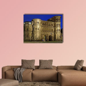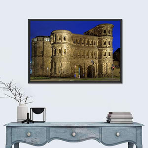The Porta Nigra Canvas Wall Art presents the ancient gate in a photo-realistic cityscape, centered in frame with its arches, towers and stone facade. Warm gold and brown tones against deep blues create a historic, grand, and imposing evening atmosphere. Suited to modern or classic living spaces and entryways as an architectural focal point.
