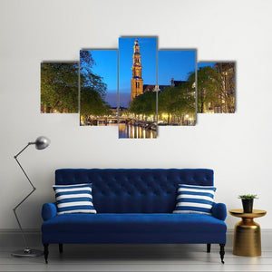 This horizontal canvas art captures a serene evening scene in Amsterdam, featuring the iconic Westerkerk tower reflected in the tranquil waters of a canal. The calming palette of blue, yellow, and green adds a peaceful atmosphere, making it a fitting choice for room decor.