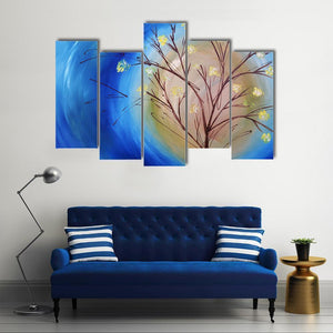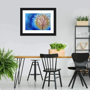A centered fall tree rises against concentric blue swirls, rendered with loose brushstrokes, brown branches, and yellow blossoms for a calm yet vibrant, ethereal feeling. The abstract, modern composition reads expressive and works well in modern homes or contemporary rooms seeking thoughtful wall art.