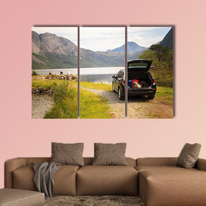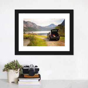 A realistic landscape showing a car by a mountain lake, with an open trunk, people by the water, and a dirt road. The green, blue, gray and brown palette gives a serene, adventurous, nature-inspired mood. Suited to modern or nature-focused rooms as a calm, natural focal piece.