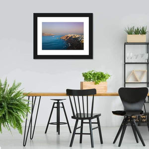 Sunset At Santorini In Oia offers a high-angle, wide view of the coastal town of Oia, showing white buildings on cliffs, several sailboats and a calm sea at sunset. The realistic, scenic canvas uses blues, whites, browns and soft purples to create a serene, picturesque atmosphere that suits coastal or modern room decor.