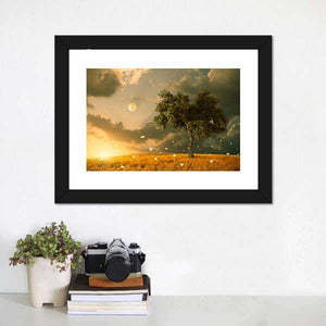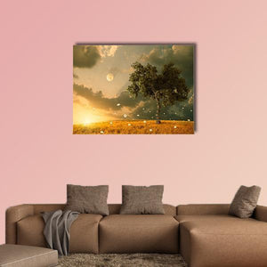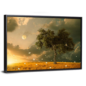 Flying Flowers & Tree Canvas Wall Art features a solitary tree in a golden-green field beneath a moonlit sky, with floating white flowers and dramatic clouds. Composed using the rule of thirds, the scene feels ethereal and serene, with dreamy gold, green, gray, and white tones. Its modern landscape style suits contemporary living spaces and nature-inspired rooms.