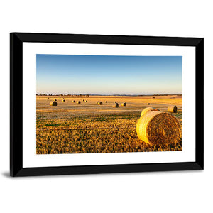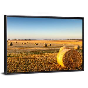 This beautiful canvas art captures serene hay bales resting in a golden field under a breathtaking sunset. The peaceful rural scene showcases rich hues of brown, gold, blue, and yellow, creating a warm atmosphere that complements any space.