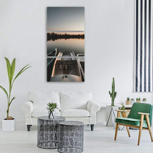 Three fishing boats rest on a lake at sunset, with soft orange and blue tones and clear reflections on the water that set a calm, serene mood. This minimalist, modern landscape print suits nature-inspired or contemporary room decor looking for a tranquil focal piece.